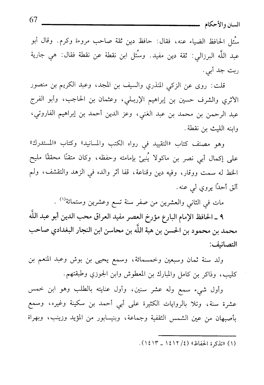 9 - الحافظ الإمام البارع مؤرخ العصر مفيد العراق محب الدين أبو عبد الله محمد بن محمود بن الحسن بن هبة الله بن محاسن ابن النجار البغدادي صاحب التصانيف: