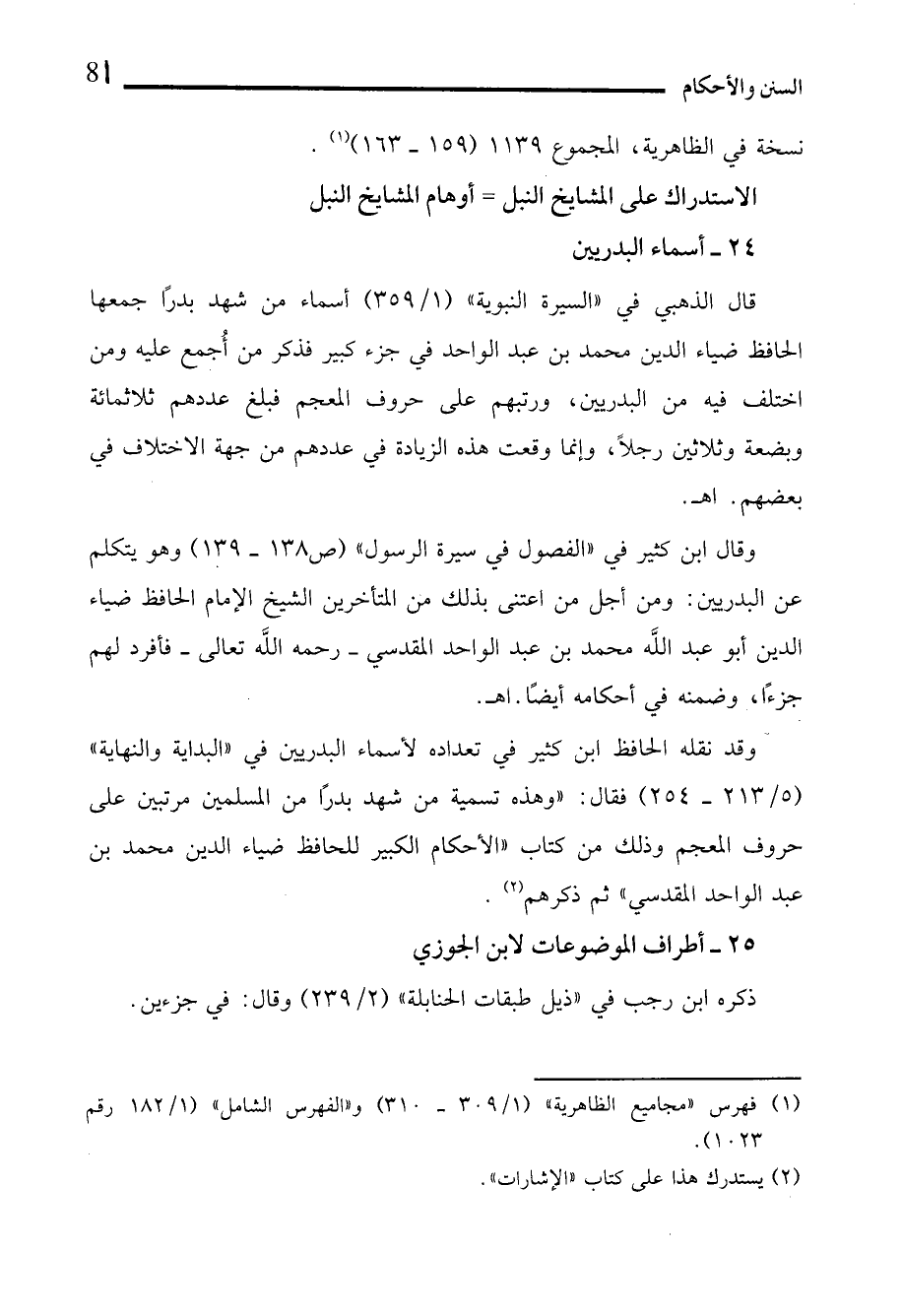 وقال ابن كثير في "الفصول في سيرة الرسول" (ص 138 - 139) وهو يتكلم عن البدريين: ومن أجل من اعتنى بذلك من المتأخرين الشيخ الإمام الحافظ ضياء الدين أبو عبد الله محمد بن عبد الواحد المقدسي -رحمه الله تعالى- فأفرد لهم جزءًا، وضمنه في أحكامه أيضًا. اهـ.