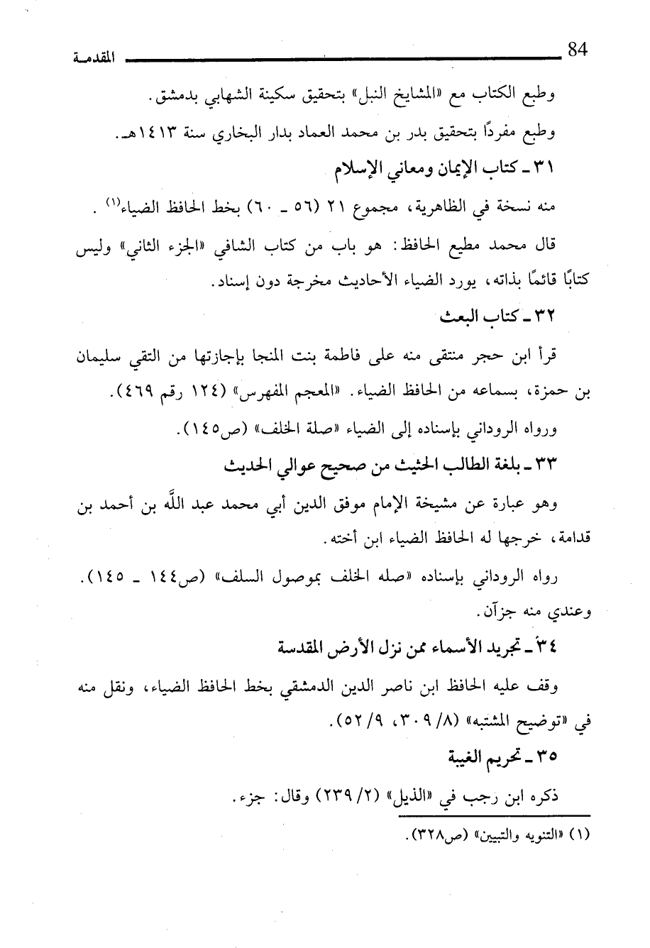 قال محمد مطيع الحافظ: هو باب من كتاب الشافي "الجزء الثاني" وليس كتابًا قائمًا بذاته، يورد الضياء الأحاديث مخرجة دون إسناد.