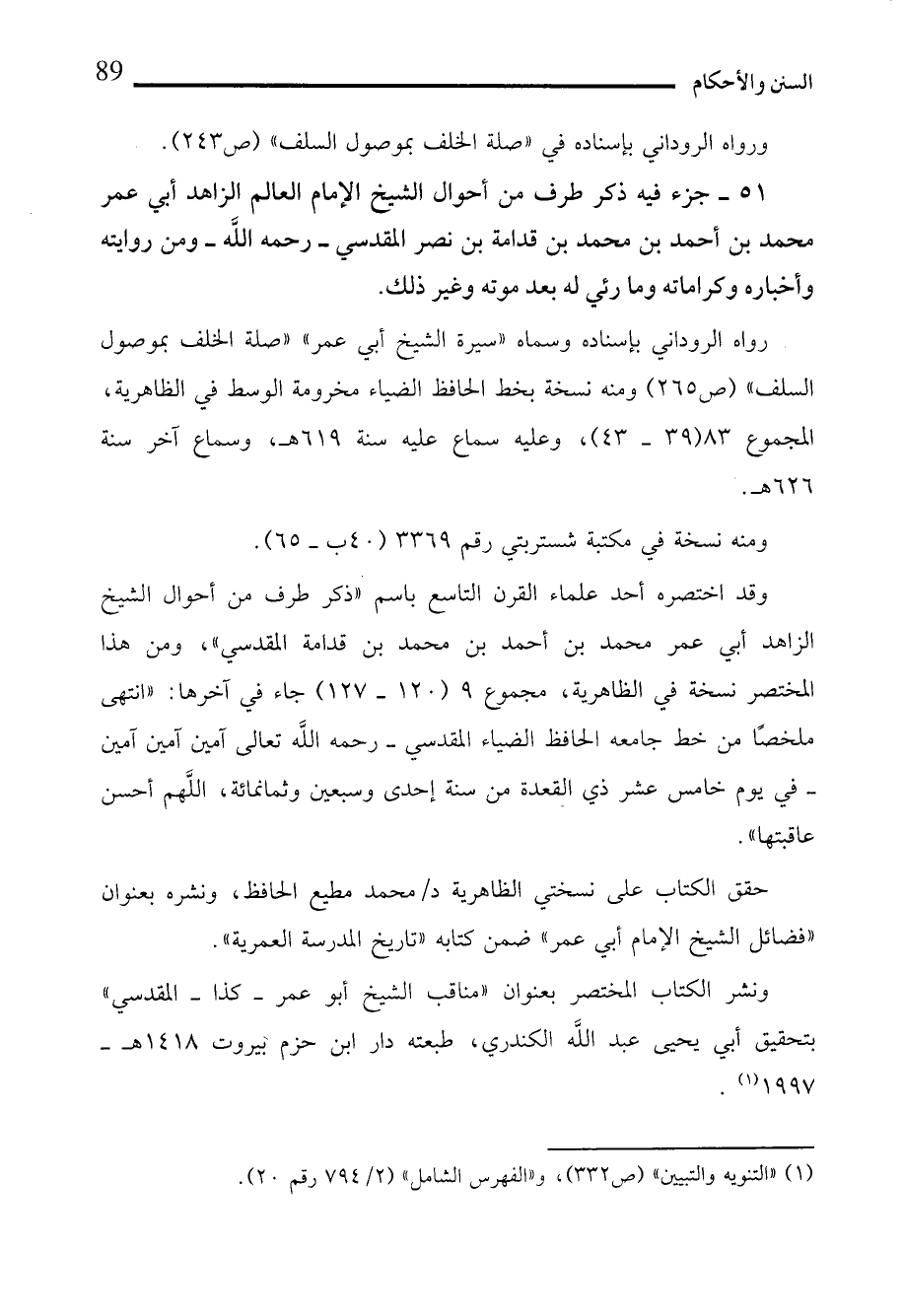 51 - جزء فيه ذكر طرف من أحوال الشيخ الإمام العالم الزاهد أبي عمر محمد بن أحمد بن محمد بن قدامة بن نصر المقدسي -رحمه الله- ومن روايته وأخباره وكراماته وما رئي له بعد موته وغير ذلك.