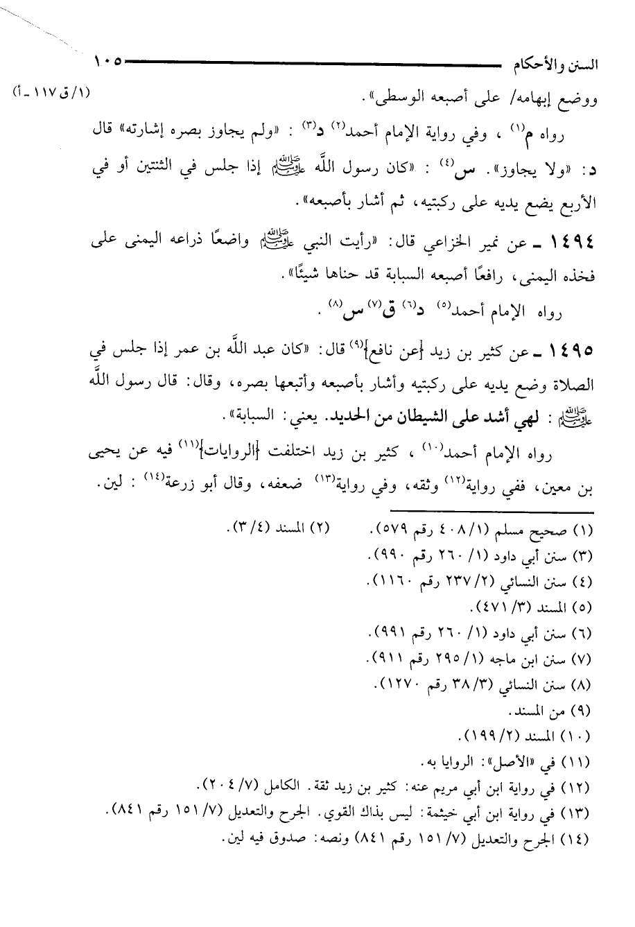 1494 - عن نمير الخزاعي قال: "رأيت النبي - صلى الله عليه وسلم - واضعًا ذراعه اليمنى على فخذه اليمنى، رافعًا أصبعه السبابة قد حناها شيئًا".