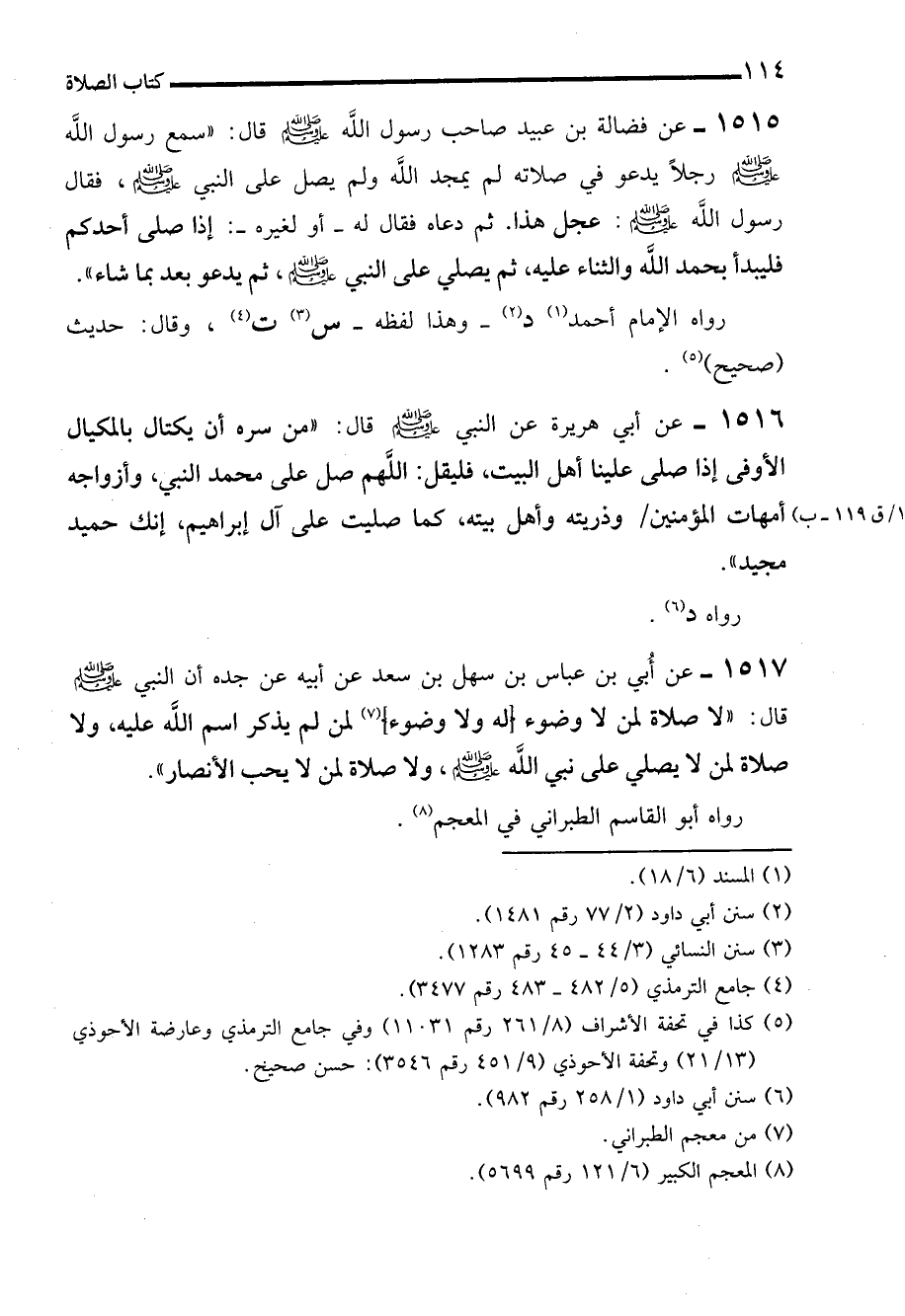 1515 - عن فضالة بن عبيد صاحب رسول الله - صلى الله عليه وسلم - قال: "سمع رسول الله - صلى الله عليه وسلم - رجلاً يدعو في صلاته لم يمجد الله ولم يصل على النبي - صلى الله عليه وسلم - فقال رسول الله - صلى الله عليه وسلم -: عجل هذا. ثم دعاه فقال له -أو لغيره-: إذا صلى أحدكم فليبدأ بحمد الله والثناء عليه، ثم يصلي على النبي - صلى الله عليه وسلم -، ثم يدعو بعد بما شاء".