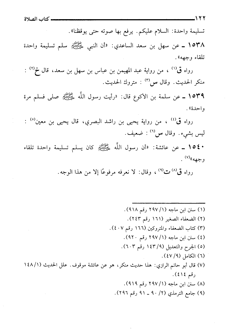 1538 - عن سهل بن سعد الساعدي: "أن النبي - صلى الله عليه وسلم - سلم تسليمة واحدة تلقاء وجهه".