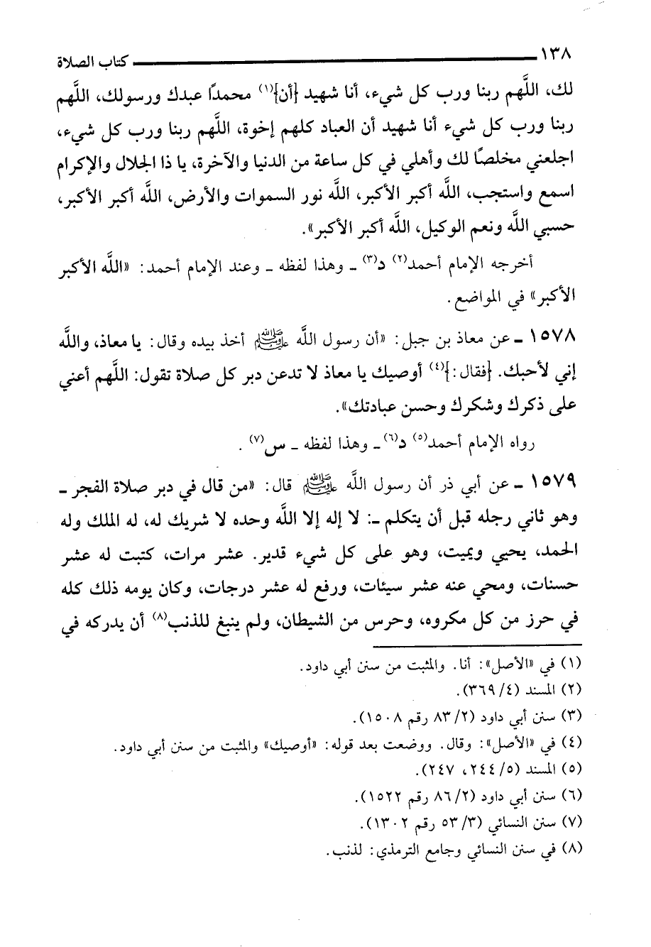 1578 - عن معاذ بن جبل: "أن رسول الله - صلى الله عليه وسلم - أخذ بيده وقال: يا معاذ، واللَّه إني لأحبك. (فقال:) (¬4) أوصيك يا معاذ لا تدعن دبر كل صلاة تقول: اللَّهم أعني على ذكرك وشكرك وحسن عبادتك".