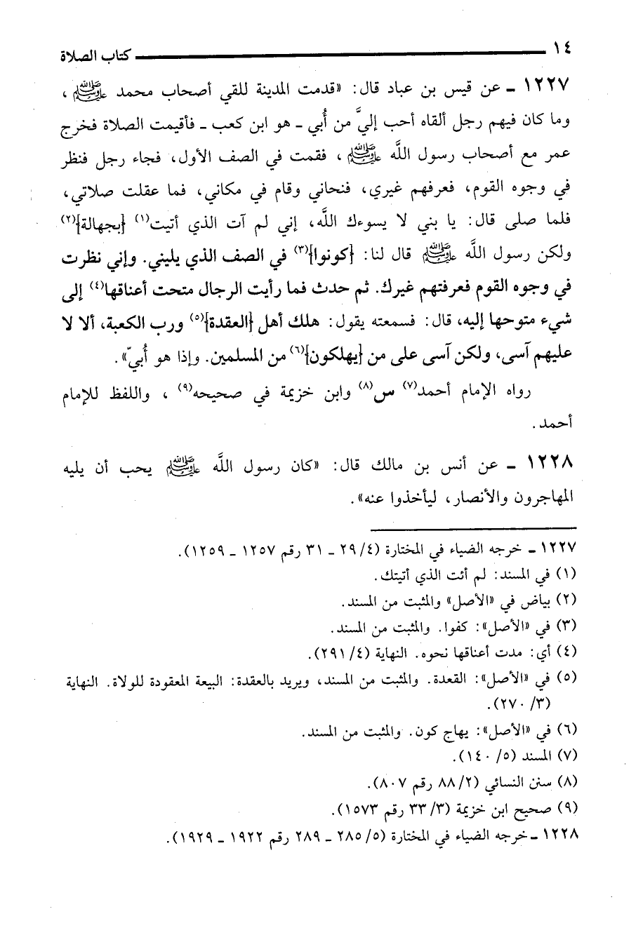 1227 - عن قيس بن عباد قال: "قدمت المدينة للقي أصحاب محمد - صلى الله عليه وسلم -، وما كان فيهم رجل ألقاه أحب إليَّ من أُبي -هو ابن كعب- فأقيمت الصلاة فخرج عمر مع أصحاب رسول الله - صلى الله عليه وسلم -، فقمت في الصف الأول، فجاء رجل فنظر في وجوه القوم، فعرفهم غيري، فنحاني وقام في مكاني، فما عقلت صلاتي، فلما صلى قال: يا بني لا يسوءك الله، إني لم آت الذي أتيت (¬1) (بجهالة) (¬2) ولكن رسول الله - صلى الله عليه وسلم - قال لنا: (كونوا) (¬3) في الصف الذي يليني. وإني نظرت في وجوه القوم فعرفتهم غيرك. ثم حدث فما رأيت الرجال متحت أعناقها (¬4) إلى شيء متوحها إليه، قال: فسمعته يقول: هلك أهل (العقدة) (¬5) ورب الكعبة، ألا لا عليهم آسى، ولكن آسى على من (يهلكون) (¬6) من المسلمين. وإذا هو أُبيّ".