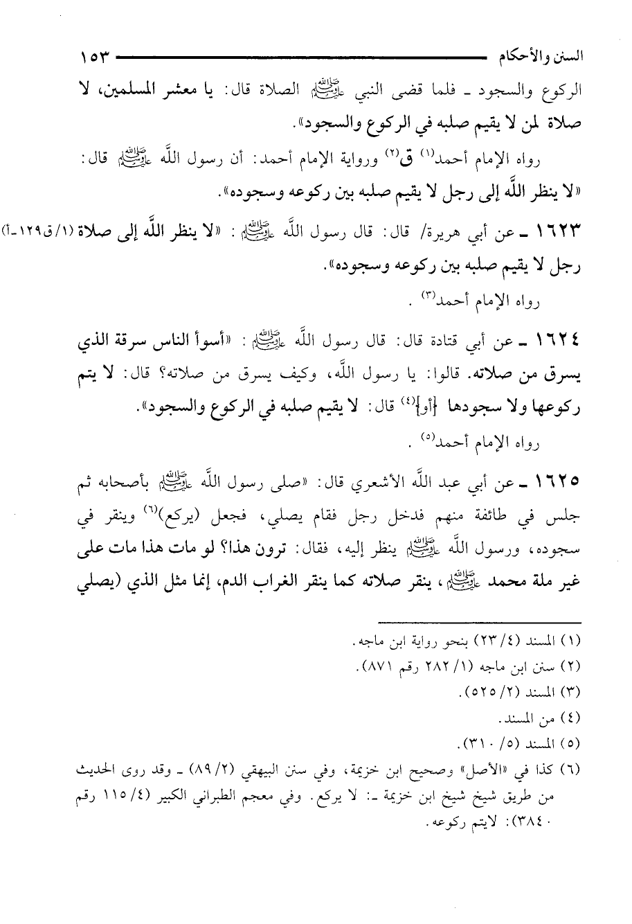 1623 - عن أبي هريرة قال: قال رسول الله - صلى الله عليه وسلم -: "لا ينظر الله إلى صلاة رجل لا يقيم صلبه بين ركوعه وسجوده".