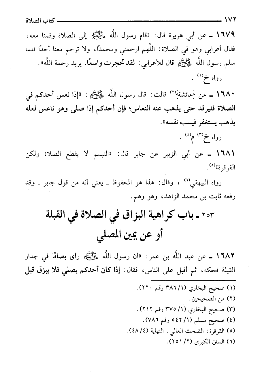 1682 - عن عبد الله بن عمر: "أن رسول الله - صلى الله عليه وسلم - رأى بصاقًا في جدار القبلة فحكه، ثم أقبل على الناس، فقال: إذا كان أحدكم يصلي فلا يبزق قبل
