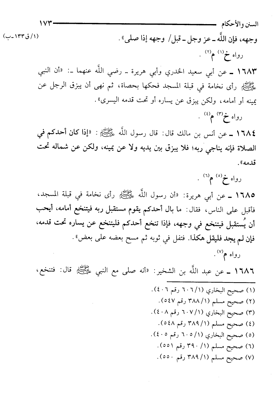 1685 - عن أبي هريرة: "أن رسول الله - صلى الله عليه وسلم - رأى نخامة في قبلة المسجد، فأقبل على الناس، فقال: ما بال أحدكم يقوم مستقبل ربه فيتنخع أمامه، أيحب أن يُستقبل فيتنخع في وجهه، فإذا تنخع أحدكم فليتنخع عن يساره تحت قدمه، فإن لم يجد فليقل هكذا. فتفل في ثوبه ثم مسح بعضه على بعض".