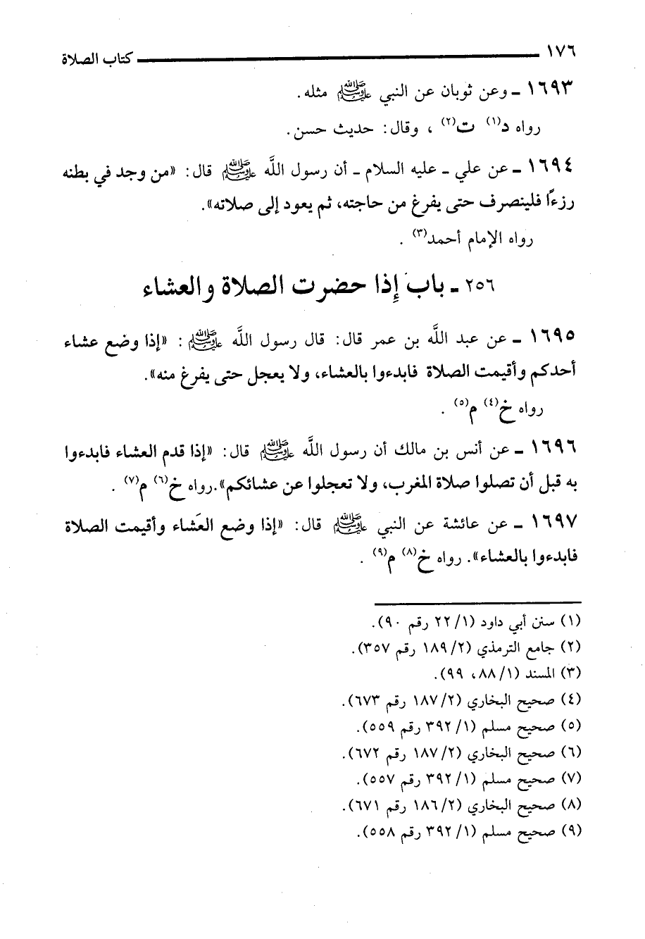 1696 - عن أنس بن مالك أن رسول الله - صلى الله عليه وسلم - قال: "إذا قدم العشاء فابدءوا به قبل أن تصلوا صلاة المغرب، ولا تعجلوا عن عشائكم". رواه خ (¬6) م (¬7).
