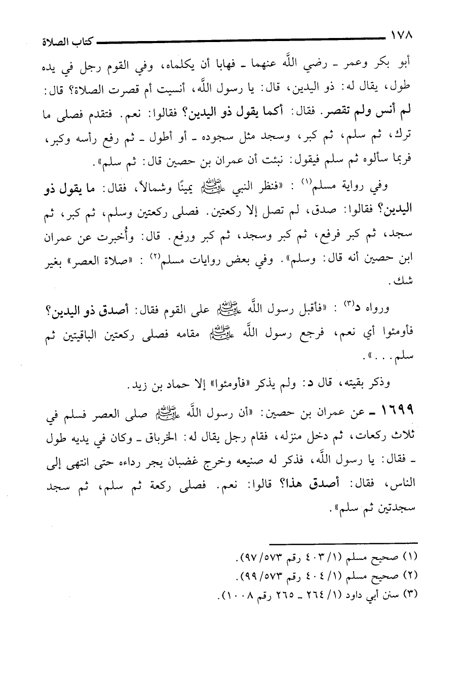1699 - عن عمران بن حصين: "أن رسول الله - صلى الله عليه وسلم - صلى العصر فسلم في ثلاث ركعات، ثم دخل منزله، فقام رجل يقال له: الخرباق -وكان في يديه طول- فقال: يا رسول الله، فذكر له صنيعه وخرج غضبان يجر رداءه حتى انتهى إلى الناس، فقال: أصدق هذا؟ قالوا: نعم. فصلى ركعة ثم سلم، ثم سجد سجدتين ثم سلم".