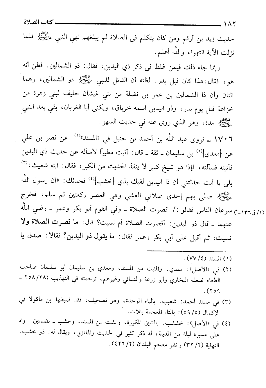 1706 - فروى عبد الله بن أحمد بن حنبل في "المسند" (¬1) عن نصر بن علي عن (معدي) (¬2) بن سليمان -ثقة- قال: أتيت مطيرًا لأسأله عن حديث ذي اليدين فأتيته فسألته، فإذا هو شيخ كبير لا ينفذ الحديث من الكبر، فقال: ابنه شعيث: (¬3) بلى يا أبت حدثتنى أن ذا اليدين لقيك بذي (خشب) (¬4) فحدثك: "أن رسول الله - صلى الله عليه وسلم - صلى بهم إحدى صلاتي العشي وهي العصر ركعتين ثم سلم، فخرج سرعان الناس فقالوا: قصرت الصلاة -وفي القوم أبو بكر وعمر -رضي الله عنهما- قال ذو اليدين: أقصرت الصلاة أم نسيت؟ قال: ما قصرت الصلاة ولا نسيت، ثم أقبل على أبي بكر وعمر فقال: ما يقول دْو اليدين؟ فقالا: صدق يا