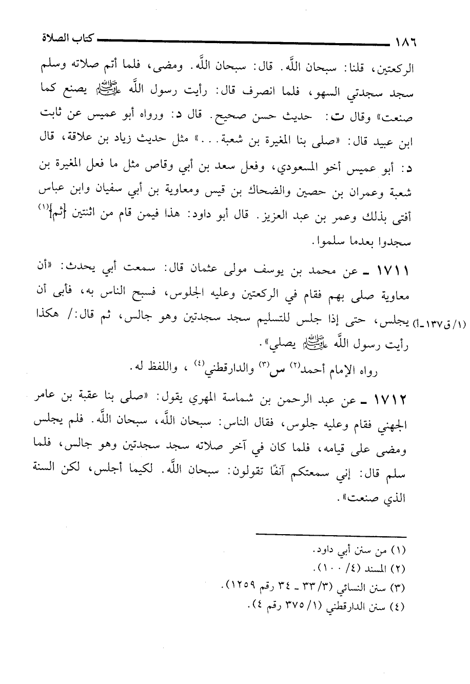 1712 - عن عبد الرحمن بن شماسة المهري يقول: "صلى بنا عقبة بن عامر الجهني فقام وعليه جلوس، فقال الناس: سبحان الله، سبحان الله. فلم يجلس ومضى على قيامه، فلما كان في آخر صلاته سجد سجدتين وهو جالس، فلما سلم قال: إني سمعتكم آنفًا تقولون: سبحان الله. لكيما أجلس، لكن السنة الذي صنعت".