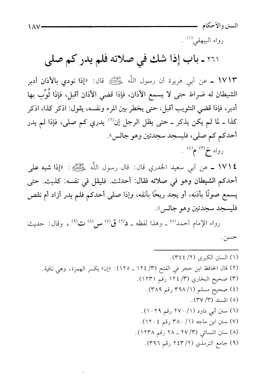 1714 - عن أبي سعيد الخدري قال: قال رسول الله - صلى الله عليه وسلم -: "إذا شبه على أحدكم الشيطان وهو في صلاته فقال: أحدثت. فليقل في نفسه: كذبت. حتى يسمع صوتًا بأذنه، أو يجد ريحًا بأنفه، وإذا صلى أحدكم فلم يدر أزاد أم نقص فليسجد سجدتين وهو جالس".