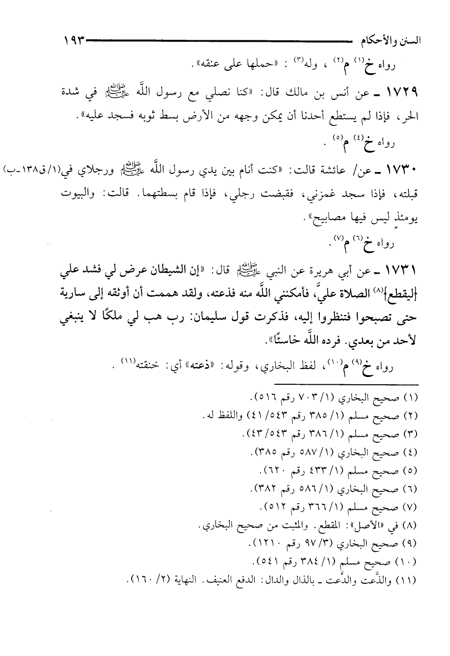 1730 - عن عائشة قالت: "كنت أنام بين يدي رسول الله - صلى الله عليه وسلم - ورجلاي في قبلته، فإذا سجد غمزني، فقبضت رجلي، فإذا قام بسطتهما. قالت: والبيوت يومئذٍ ليس فيها مصابيح".