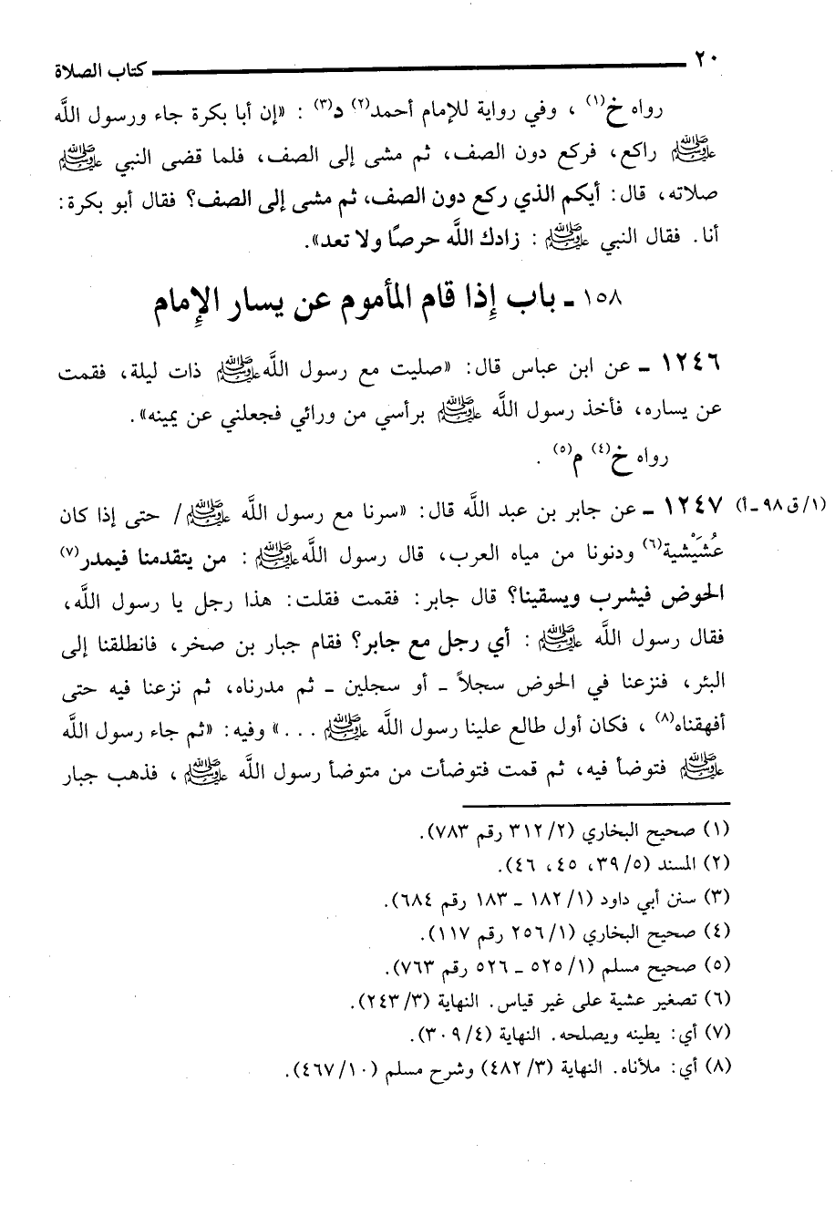 1246 - عن ابن عباس قال: "صليت مع رسول اللَّه - صلى الله عليه وسلم - ذات ليلة، فقمت عن يساره، فأخذ رسول الله - صلى الله عليه وسلم - برأسي من ورائي فجعلني عن يمينه".