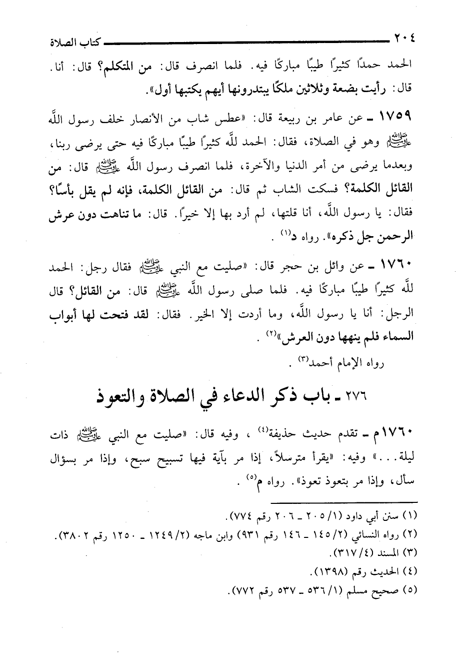 1760 - عن وائل بن حجر قال: "صليت مع النبي - صلى الله عليه وسلم - فقال رجل: الحمد للَّه كثيراً طيبًا مباركًا فيه. فلما صلى رسول الله - صلى الله عليه وسلم - قال: من القائل؟ قال الرجل: أنا يا رسول الله، وما أردت إلا الخير. فقال: لقد فتحت لها أبواب السماء فلم ينهها دون العرش" (¬2).