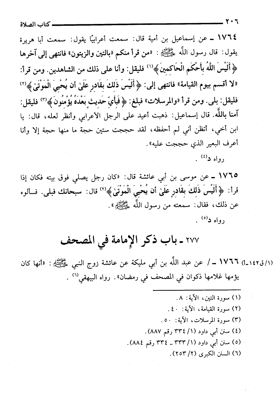 1765 - عن موسى بن أبي عائشة قال: "كان رجل يصلي فوق بيته فكان إذا قرأ: (أَلَيْسَ ذَلِكَ بِقَادِرٍ عَلَى أن يُحْييِ الْمَوْتَى) (2) قال: سبحانك فبلى. فسألوه عن ذلك، فقال: سمعته من رسول الله - صلى الله عليه وسلم -".