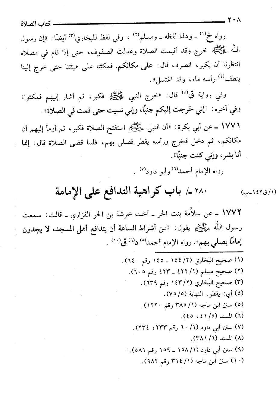 1772 - عن سلاَّمة بنت الحر -أخت خرشة بن الحر الفزاري- قالت: سمعت رسول الله - صلى الله عليه وسلم - يقول: "من أشراط الساعة أن يتدافع أهل المسجد، لا يجدون إمامًا يصلي بهم". رواه الإمام أحمد (¬8) د (¬9) ق (¬10).