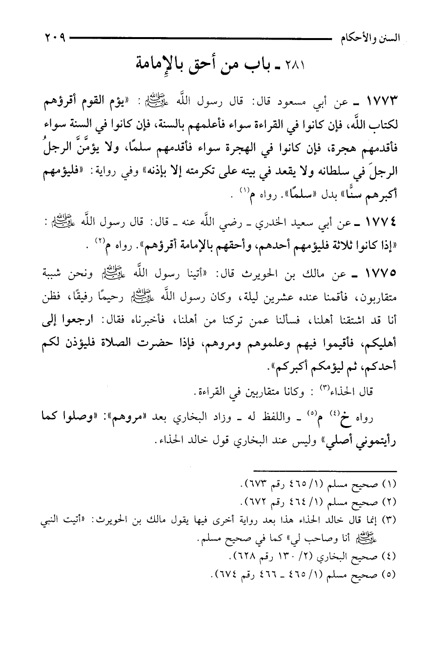 1773 - عن أبي مسعود قال: قال رسول الله - صلى الله عليه وسلم - "يؤم القوم أقرؤهم لكتاب الله، فإن كانوا في القراءة سواء فأعلمهم بالسنة، فإن كانوا في السنة سواء فأقدمهم هجرة، فإن كانوا في الهجرة سواء فأقدمهم سلمًا، ولا يؤمَّنَّ الرجلُ الرجلَ في سلطانه ولا يقعد في بيته على تكرمته إلا بإذنه" وفي رواية: "فليؤمهم اكبرهم سنًّا" بدل "سلمًا". رواه م (¬1).