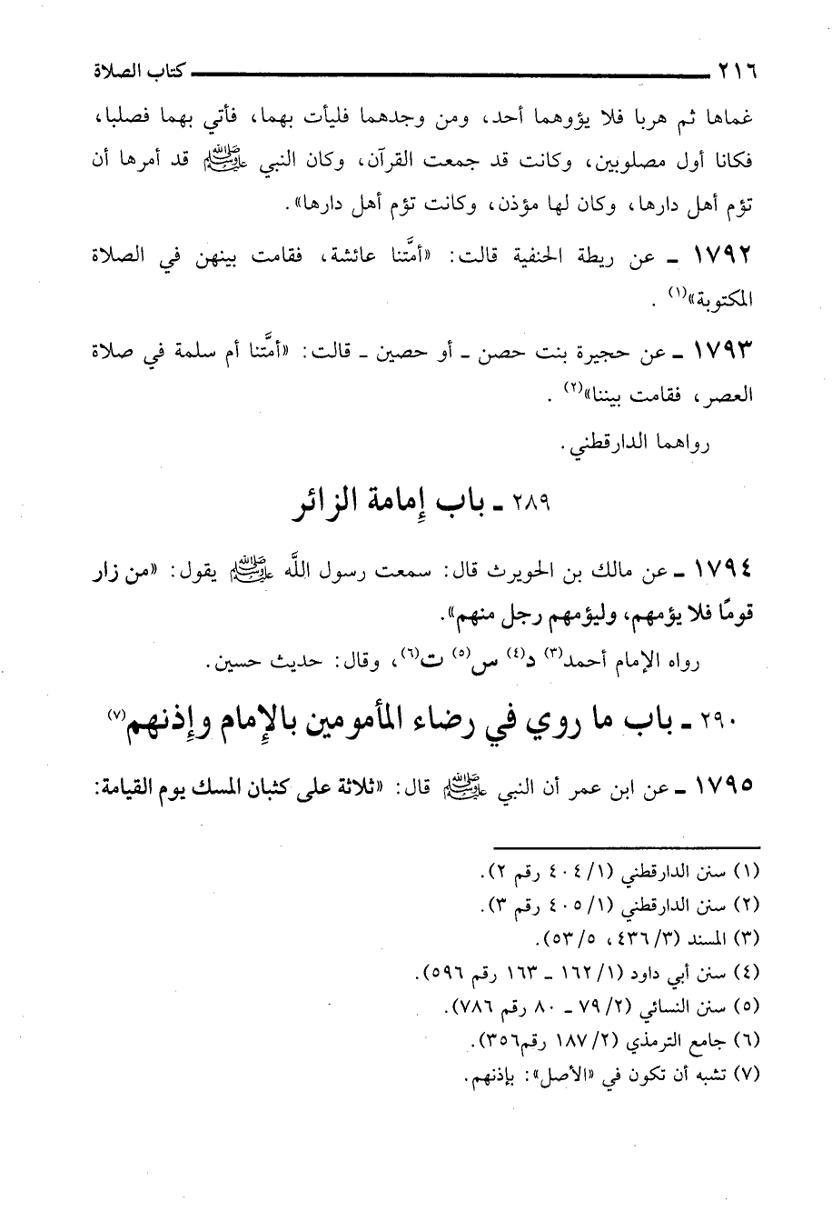 1794 - عن مالك بن الحويرث قال: سمعت رسول الله - صلى الله عليه وسلم - يقول: "من زار قومًا فلا يؤمهم، وليؤمهم رجل منهم".