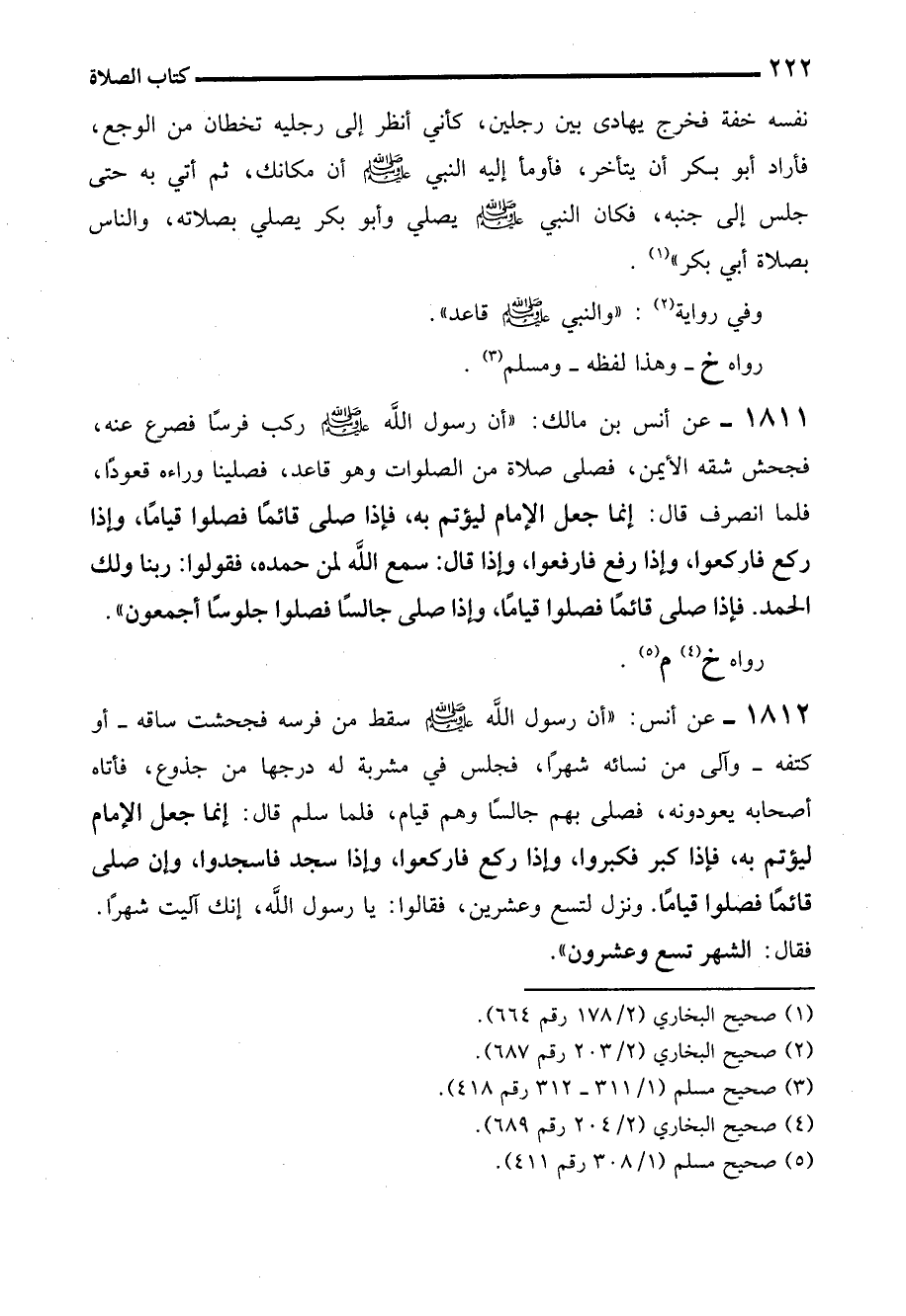 1812 - عن أنس: "أن رسول الله - صلى الله عليه وسلم - سقط من فرسه فجحشت ساقه -أو كتفه- وآلى من نسائه شهرًا، فجلس في مشربة له درجها من جذوع، فأتاه أصحابه يعودونه، فصلى بهم جالسًا وهم قيام، فلما سلم قال: إنما جعل الإمام ليؤتم به، فإذا كبر فكبروا، وإذا ركع فاركعوا، وإذا سجد فاسجدوا، وإن صلى قائمًا فصلوا قيامًا. ونزل لتسع وعشرين، فقالوا: يا رسول الله، إنك آليت شهرًا. فقال: الشهر تسع وعشرون".