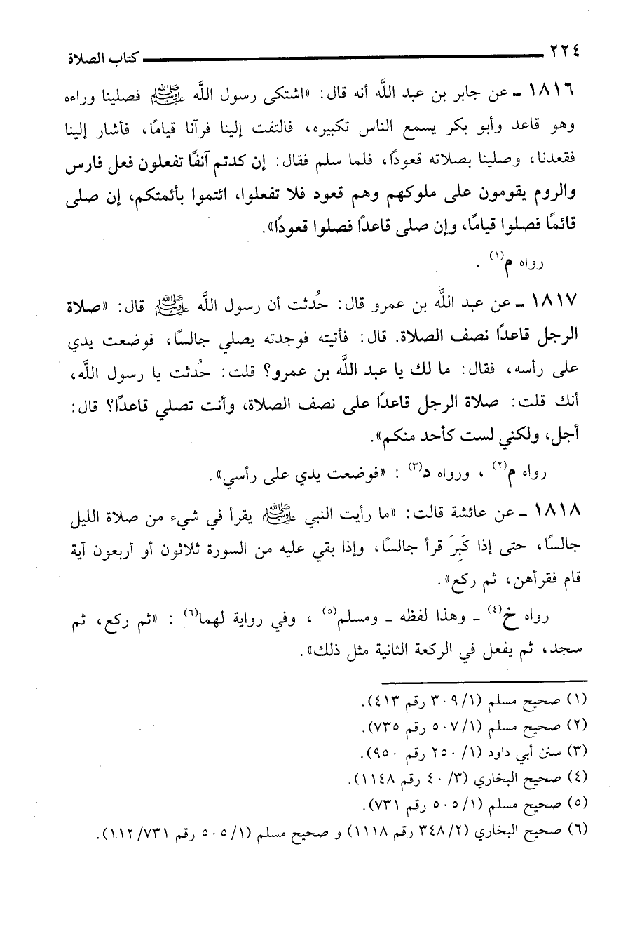 1817 - عن عبد الله بن عمرو قال: حُدثت أن رسول الله - صلى الله عليه وسلم - قال: "صلاة الرجل قاعدًا نصف الصلاة. قال: فأتيته فوجدته يصلي جالسًا، فوضعت يدي على رأسه، فقال: مالك يا عبد الله بن عمرو؟ قلت: حُدثت يا رسول الله، أنك قلت: صلاة الرجل قاعدًا على نصف الصلاة، وأنت تصلي قاعدًا؟ قال: أجل، ولكني لست كأحد منكم".
