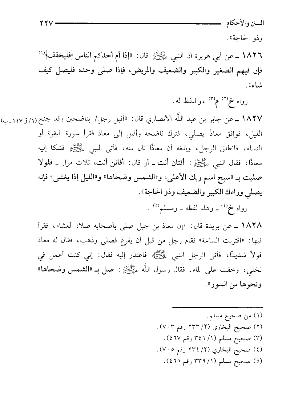 1827 - عن جابر بن عبد الله الأنصاري قال: "أقبل رجل بناضحين وقد جنح الليل، فوافق معاذًا يصلي، فترك ناضحه وأقبل إلى معاذ فقرأ سورة البقرة أو النساء، فانطلق الرجل، وبلغه أن معاذًا نال منه، فأتى النبي - صلى الله عليه وسلم - فشكا إليه معاذًا، فقال النبي - صلى الله عليه وسلم -: أفتان أنت -أو قال: أفاتن أنت، ثلاث مرار- فلولا صليت بـ "سبح اسم ربك الأعلى" و"الشمس وضحاها" و"الليل إذا يغشى" فإنه يصلي وراءك الكبير والضعيف وذو الحاجة".