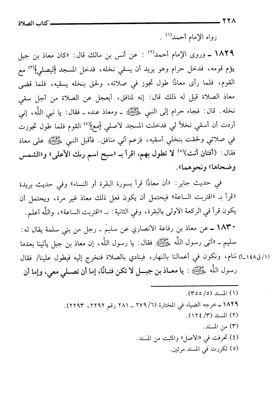 1829 - وروى الإمام أحمد (¬2): عن أنس بن مالك قال: "كان معاذ بن جبل يؤم قومه، فدخل حرام وهو يريد أن يسقي نخله، فدخل المسجد (ليصلي) (¬3) مع القوم، فلما رأى معاذًا طول تجوز في صلاته، ولحق بنخله يسقيه، فلما قضى معاذ الصلاة قيل له ذلك قال: إنه لمنافق، أيعجل عن الصلاة من أجل سقي نخله. قال: فجاء حرام إلى النبي - صلى الله عليه وسلم -ومعاذ عنده- فقال: يا نبي الله، إني أردت أن أسقي نخلاً لي فدخلت المسجد لأصلي (مع) (¬4) القوم فلما طول تجوزت في صلاتي ولحقت بنخلي أسقيه، فزعم أني منافق. فأقبل النبي - صلى الله عليه وسلم - على معاذ فقال: (أفتان أنت) (¬5) لا تطول بهم، اقرأب "سبح اسم ربك الأعلى" و"الشمس وضحاها" ونحوهما".