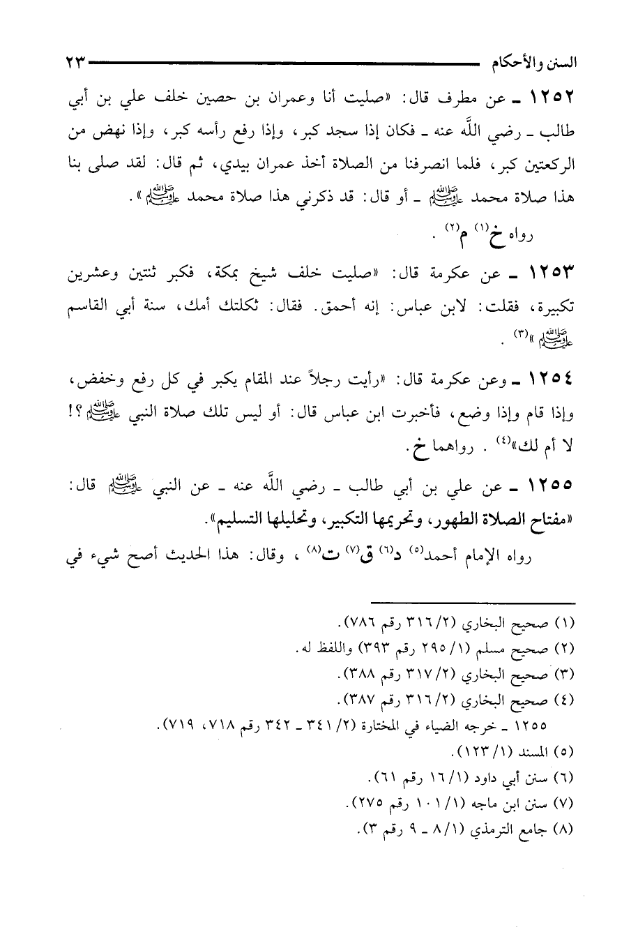 1252 - عن مطرف قال: "صليت أنا وعمران بن حصين خلف علي بن أبي طالب -رضي الله عنه- فكان إذا سجد كبر، وإذا رفع رأسه كبر، وإذا نهض من الركعتين كبر، فلما انصرفنا من الصلاة أخذ عمران بيدي، ثم قال: لقد صلى بنا هذا صلاة محمد - صلى الله عليه وسلم -أو قال: قد ذكرني هذا صلاة محمد - صلى الله عليه وسلم -.