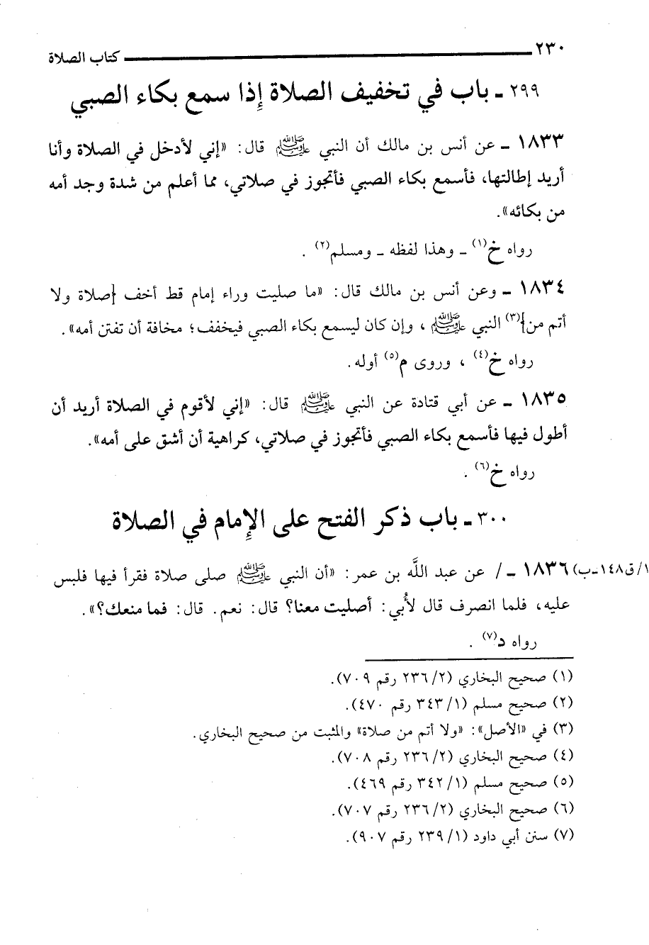 1833 - عن أنس بن مالك أن النبي - صلى الله عليه وسلم - قال: "إني لأدخل في الصلاة وأنا أريد إطالتها، فأسمع بكاء الصبي فأتجوز في صلاتي، مما أعلم من شدة وجد أمه من بكائه".