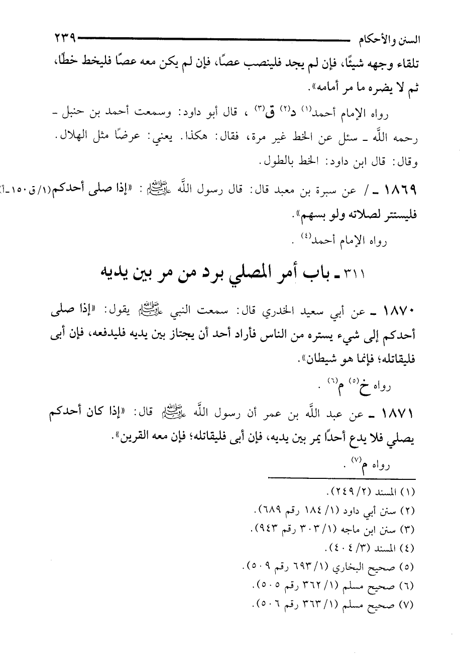 1869 - عن سبرة بن معبد قال: قال رسول الله - صلى الله عليه وسلم - "إذا صلى أحدكم فليستتر لصلاته ولو بسهم".