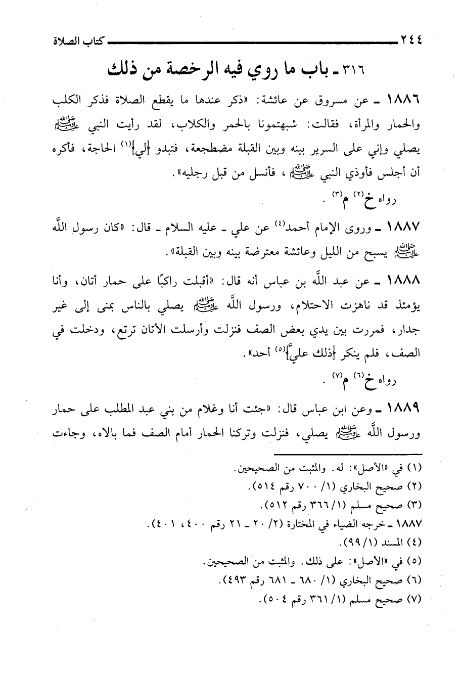 1888 - عن عبد الله بن عباس أنه قال: "أقبلت راكبًا على حمار أتان، وأنا يؤمئذ قد ناهزت الاحتلام، ورسول الله - صلى الله عليه وسلم - يصلي بالناس بمنى إلى غير جدار، فمررت بين يدي بعض الصف فنزلت وأرسلت الأتان ترتع، ودخلت في الصف، فلم ينكر (ذلك عليَّ) (¬5) أحد".