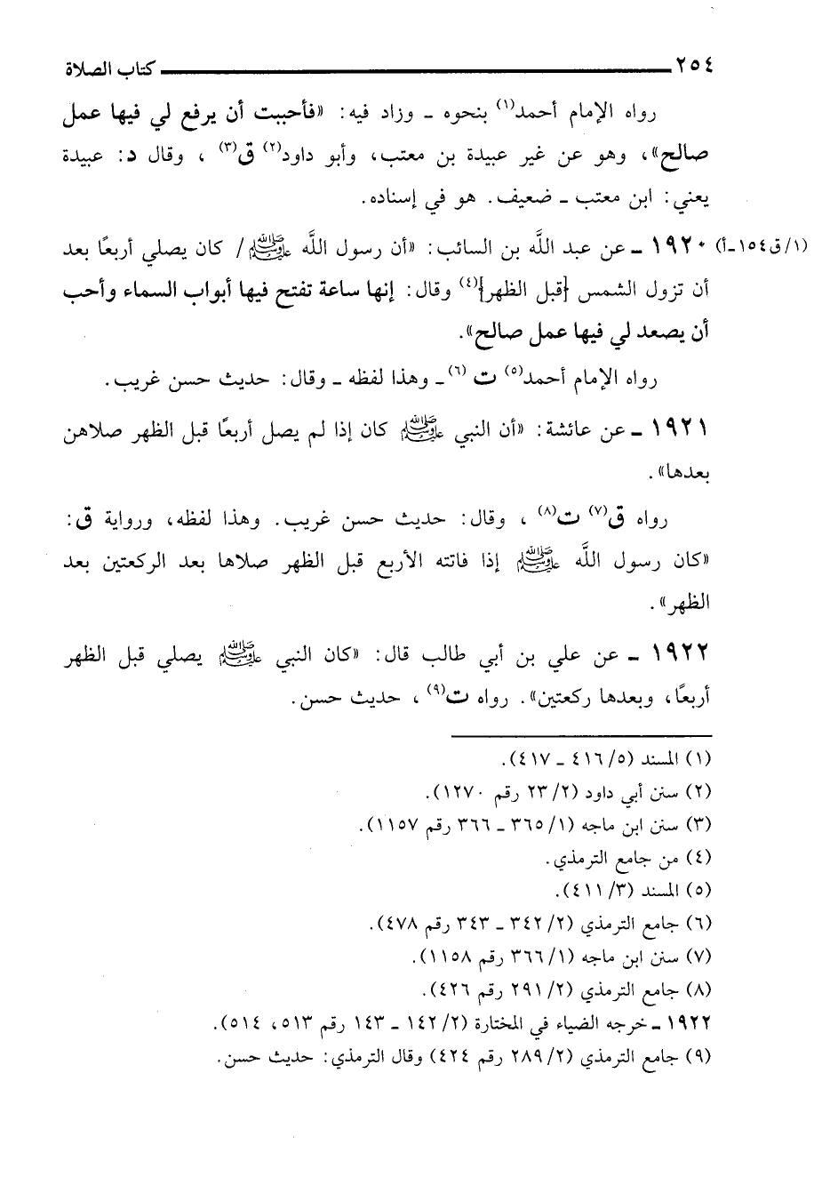 1922 - عن علي بن أبي طالب قال: "كان النبي - صلى الله عليه وسلم - يصلي قبل الظهر أربعًا، وبعدها ركعتين". رواه ت (¬9)، حديث حسن.