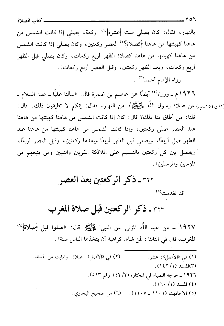 1926 م- ورواه (¬4) أيضًا عن عاصم بن ضمرة قال: "سألنا عليًّا -عليه السلام- عن صلاة رسول الله - صلى الله عليه وسلم - من النهار، فقال: إنكم لا تطيقون ذلك. قال: قلنا: من أطاق منا ذلك؟ قال: كان إذا كانت الشمس من ها هنا كهيئتها من ها هنا عند العصر صلى ركعتين، وإذا كانت الشمس من ها هنا كهيئتها من ها هنا عند الظهر صل أربعًا، ويصلي قبل الظهر أربعًا وبعدها ركعتين، وقبل العصر أربعًا، ويفصل بين كل ركعتين بالتسليم على الملائكة المقربين والنبيين ومن يتبعهم من المؤمنين والمرسلين".