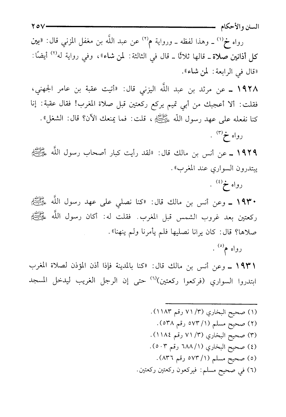 1930 - وعن أنس بن مالك قال: "كنا نصلي على عهد رسول الله - صلى الله عليه وسلم - ركعتين بعد غروب الشمس قبل المغرب. فقلت له: أكان رسول الله - صلى الله عليه وسلم - صلاها؟ قال: كان يرانا نصليها فلم يأمرنا ولم ينهنا".