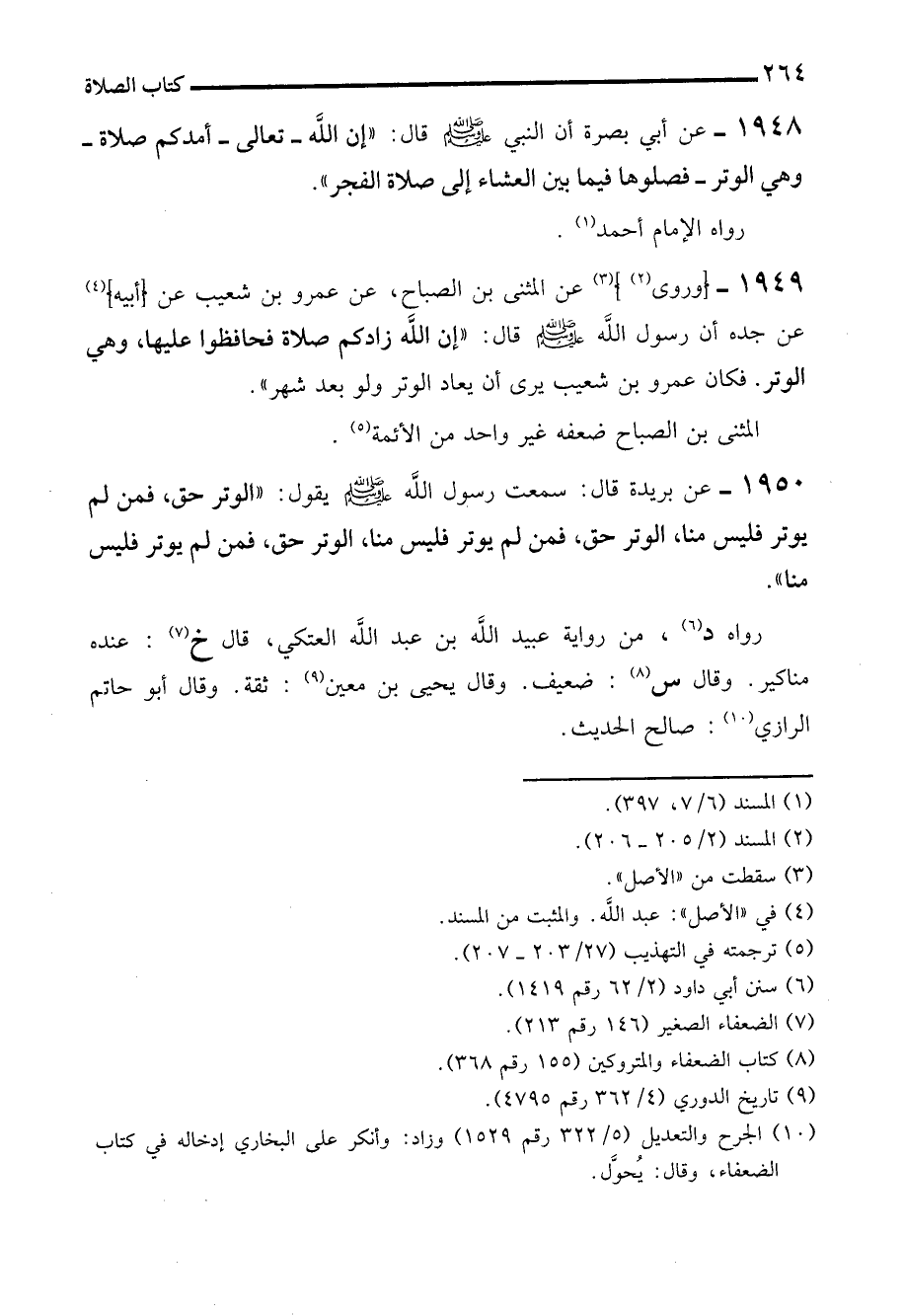 1949 - (وروى (¬2)) (¬3) عن المثنى بن الصباح، عن عمرو بن شعيب عن (أبيه) (¬4) عن جده أن رسول الله - صلى الله عليه وسلم - قال: "إن الله زادكم صلاة فحافظوا عليها، وهي الوتر. فكان عمرو بن شعيب يرى أن يعاد الوتر ولو بعد شهر".
