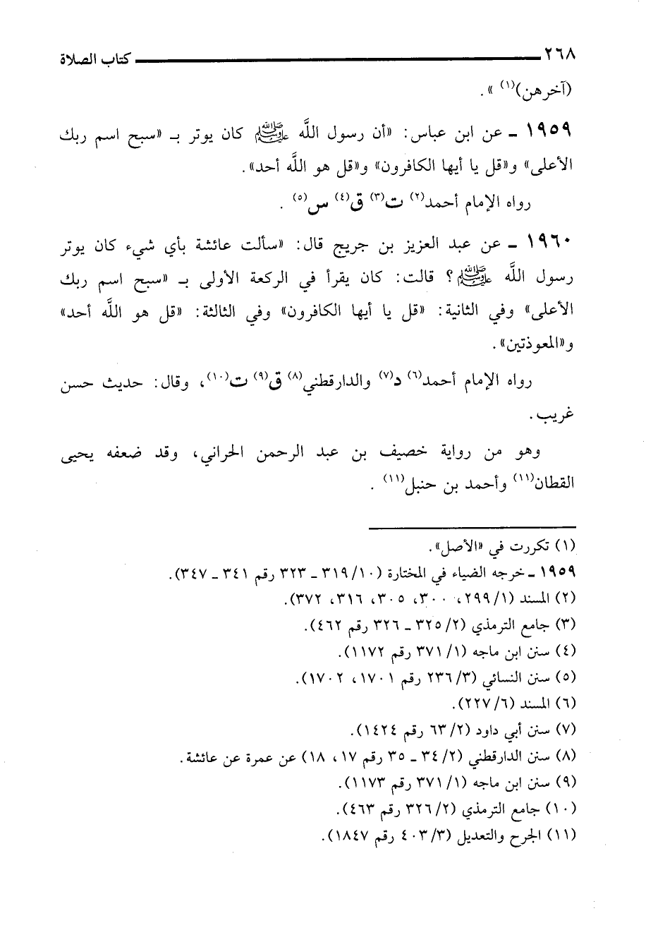 1959 - عن ابن عباس: "أن رسول الله - صلى الله عليه وسلم - كان يوتر بـ "سبح اسم ربك الأعلى" و"قل يا أيها الكافرون" و"قل هو الله أحد".