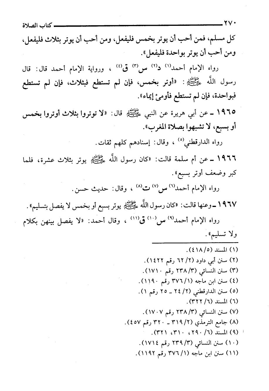 1965 - عن أبي هريرة عن النبي - صلى الله عليه وسلم - قال: "لا توتروا بثلاث أوتروا بخمس أو بسبع، لا تشبهوا بصلاة المغرب".