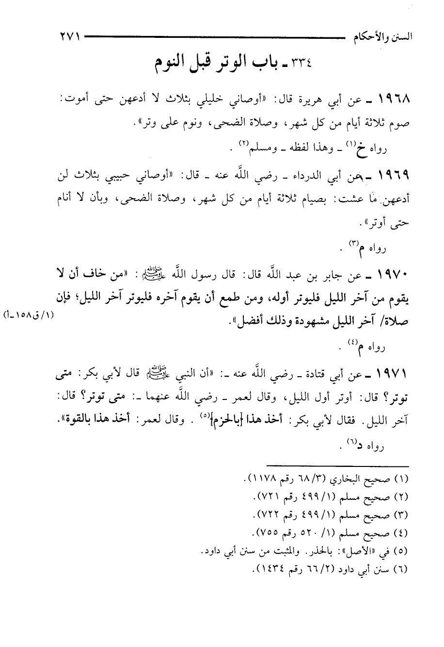 1971 - عن أبي قتادة -رضي الله عنه-: "أن النبي - صلى الله عليه وسلم - قال لأبي بكر: متى توتر؟ قال: أوتر أول الليل، وقال لعمر -رضي الله عنهما-: متى توتر؟ قال: آخر الليل. فقال لأبي بكر: أخذ هذا (بالحزم) (¬5). وقال لعمر: أخذ هذا بالقوة".