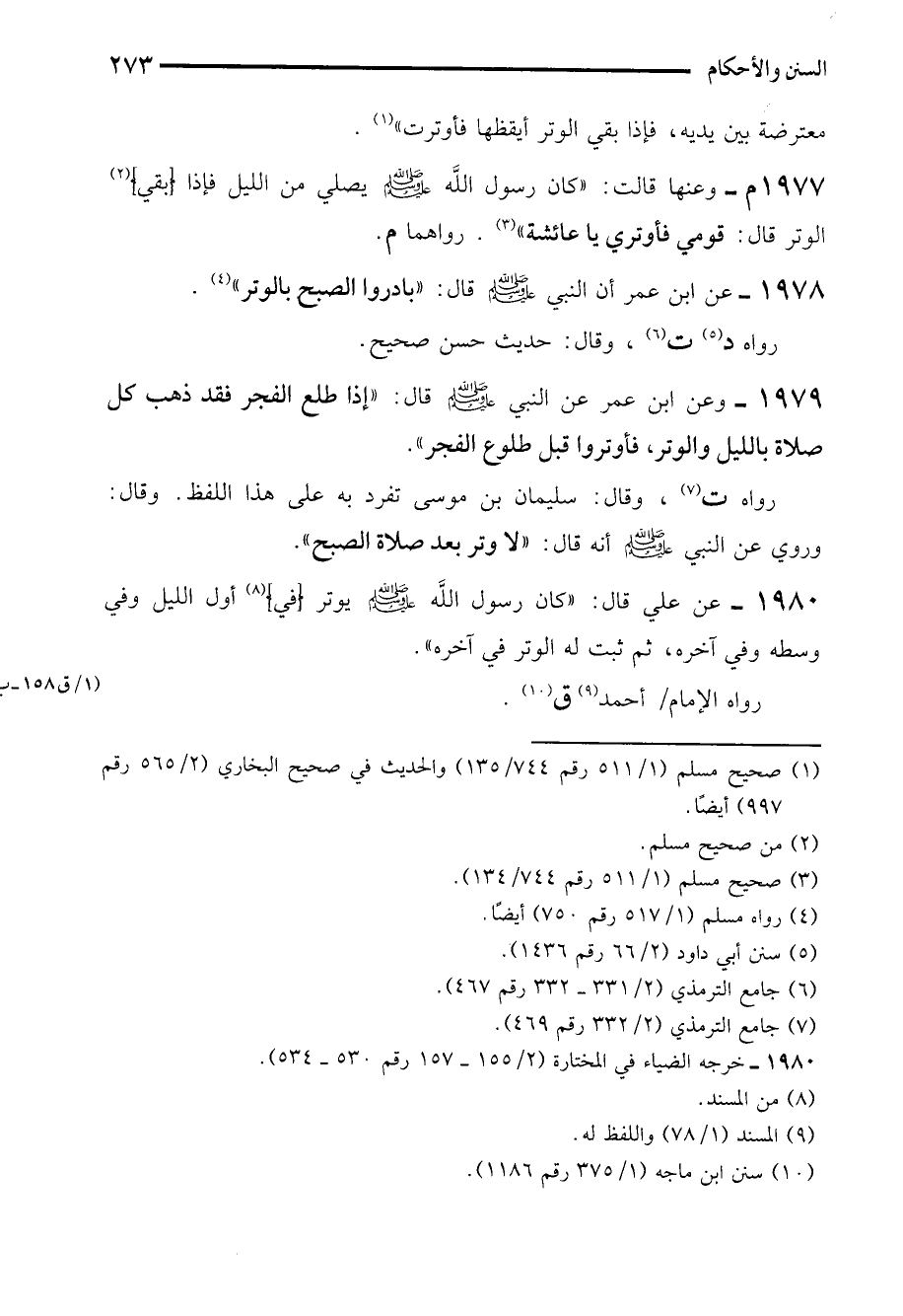 1980 - عن علي قال: "كان رسول الله - صلى الله عليه وسلم - يوتر (في) (¬8) أول الليل وفي وسطه وفي آخره، ثم ثبت له الوتر في آخره".