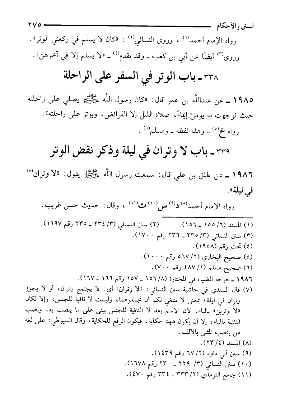 (¬7) قال السندي في حاشية سنن النسائي: "لا وتران" أي: لا يجتمع وتران، أو لا يجوز وتران في ليلة؛ بمعنى لا ينبغي لكم أن تجمعوهما، وليست لا نافية للجنس، وإلا لكان "لا وترين" بالياء؛ لأن الاسم بعد لا النافية للجنس يبنى على ما ينصب به، ونصب التثنية بالياء، إلا أن يكون هاهنا حكاية، فيكون الرفع للحكاية، وقال السيوطي: على لغة من ينصب المثنى بالألف.