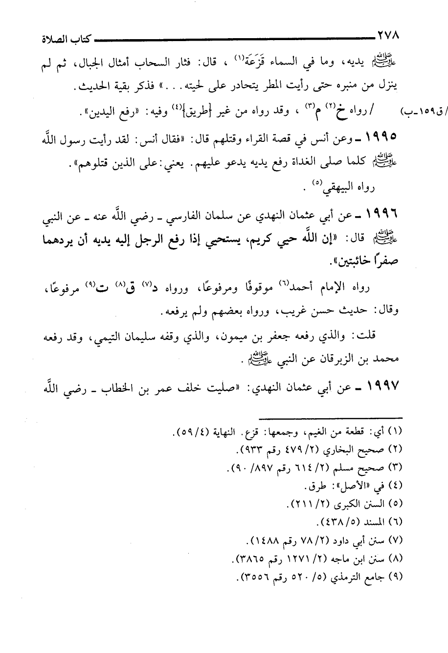 1996 - عن أبي عثمان النهدي عن سلمان الفارسي -رضي الله عنه- عن النبي - صلى الله عليه وسلم - قال: "إن الله حيي كريم، يستحي إذا رفع الرجل إليه يديه أن يردهما صفرًا خائبتين".