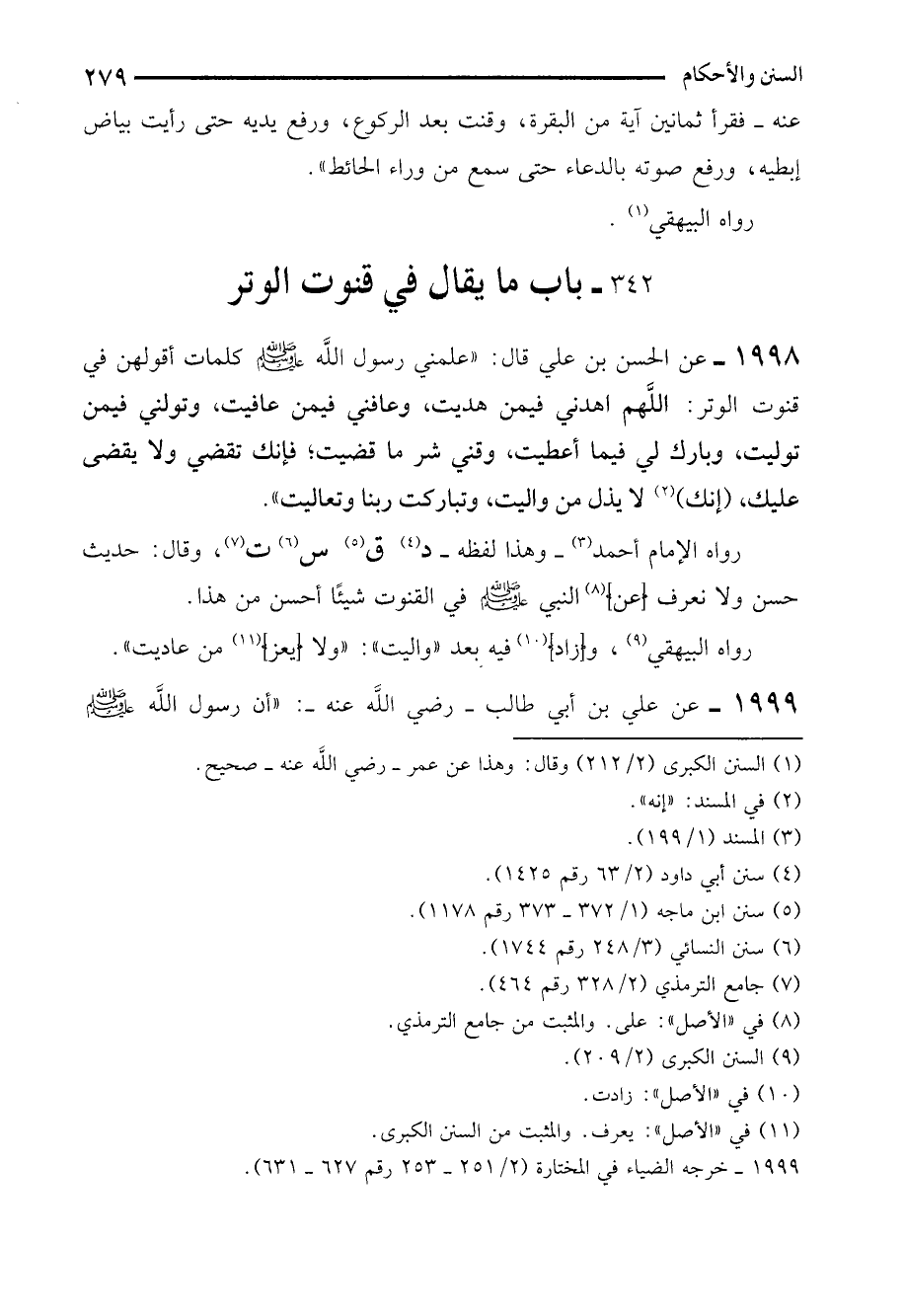 1998 - عن الحسن بن علي قال: "علمني رسول الله - صلى الله عليه وسلم - كلمات أقولهن في قنوت الوتر: اللَّهم اهدني فيمن هديت، وعافني فيمن عافيت، وتولني فيمن توليت، وبارك لي فيما أعطيت، وقني شر ما قضيت؛ فإنك تقضي ولا يقضى عليك، (إنك) (¬2) لا يذل من واليت، وتباركت ربنا وتعاليت".