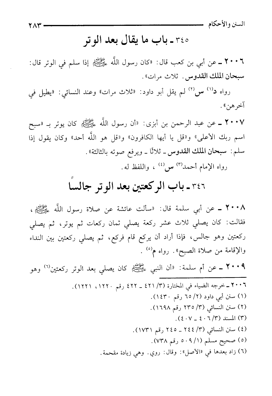 2007 - عن عبد الرحمن بن أبزى: "أن رسول الله - صلى الله عليه وسلم - كان يوتر بـ "سبح اسم ربك الأعلى" و"قل يا أيها الكافرون" و"قل هو الله أحد" وكان يقول إذا سلم: سبحان الملك القدوس -ثلاثاً- ويرفع صوته بالثالثة".