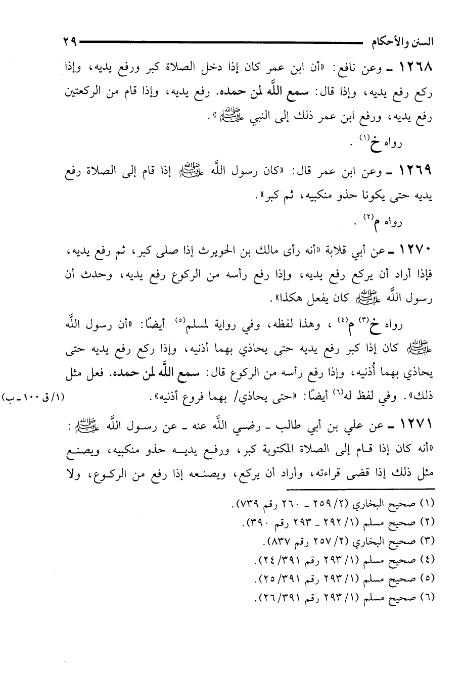 1268 - وعن نافع: "أن ابن عمر كان إذا دخل الصلاة كبر ورفع يديه، وإذا ركع رفع يديه، وإذا قال: سمع الله لمن حمده. رفع يديه، وإذا قام من الركعتين رفع يديه، ورفع ابن عمر ذلك إلى النبي - صلى الله عليه وسلم -".