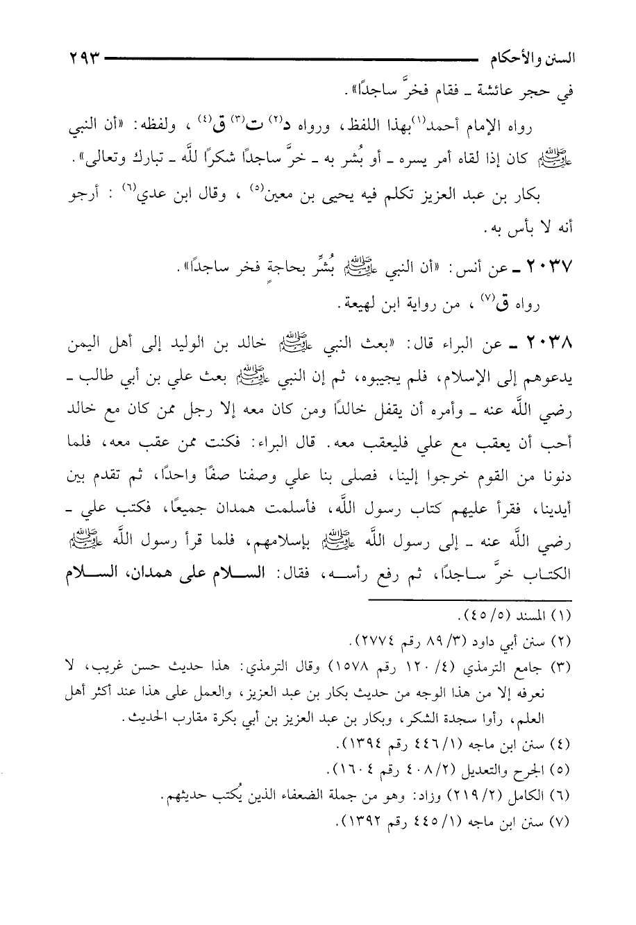 (¬3) جامع الترمذي (4/ 120 رقم 1578) وقال الترمذي: هذا حديث حسن غريب، لا نعرفه إلا من هذا الوجه من حديث بكار بن عبد العزيز، والعمل على هذا عند أكثر أهل العلم، رأوا سجدة الشكر، وبكار بن عبد العزيز بن أبي بكرة مقارب الحديث.