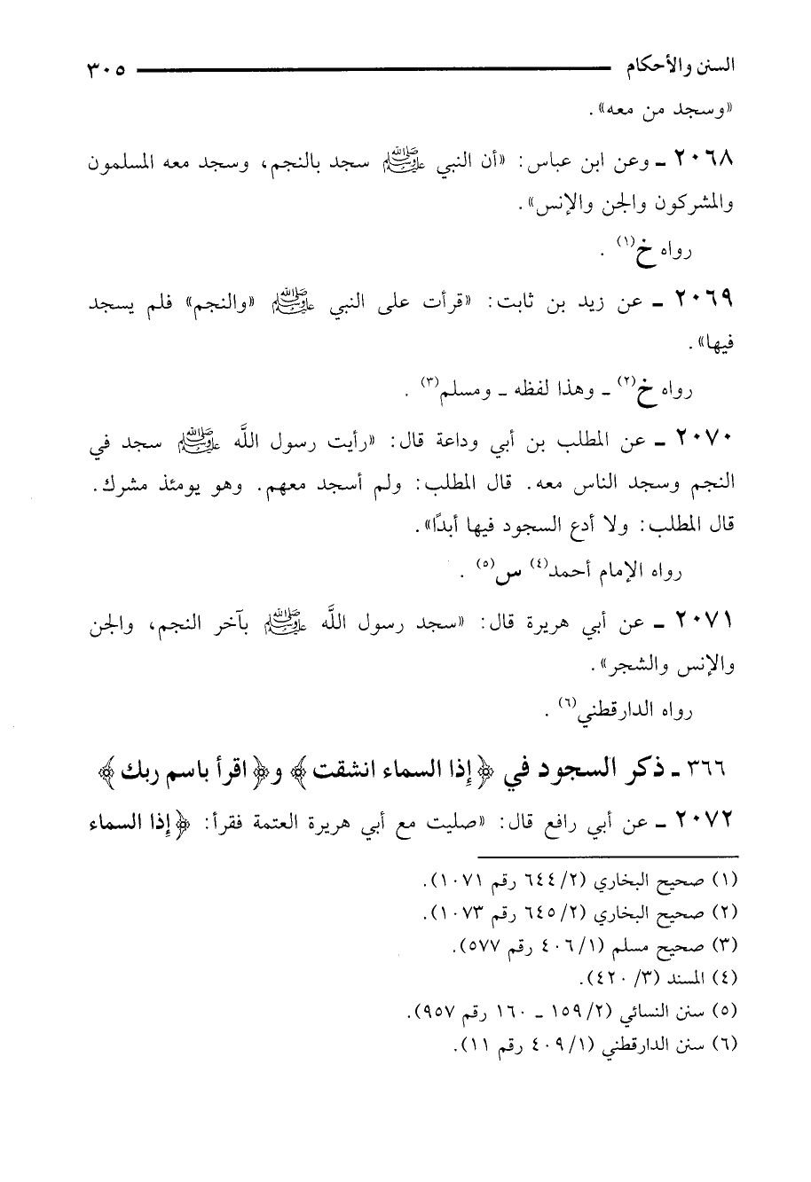 2071 - عن أبي هريرة قال: "سجد رسول الله - صلى الله عليه وسلم - بآخر النجم، والجن والإنس والشجر".
