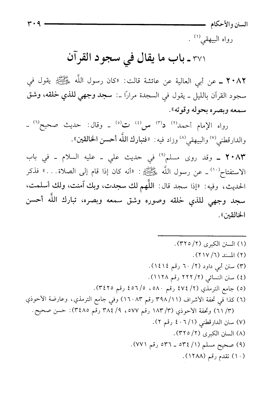 2083 - وقد روى مسلم (¬9) في حديث علي -عليه السلام- في باب الاستفتاح (¬10) - عن رسول الله - صلى الله عليه وسلم -: "أنه كان إذا قام إلى الصلاة ... " فذكر الحديث، وفيه: "إذا سجد قال: اللَّهم لك سجدت، وبك آمنت، ولك أسلمت، سجد وجهي للذي خلقه وصوره وشق سمعه وبصره، تبارك الله أحسن الخالقين".