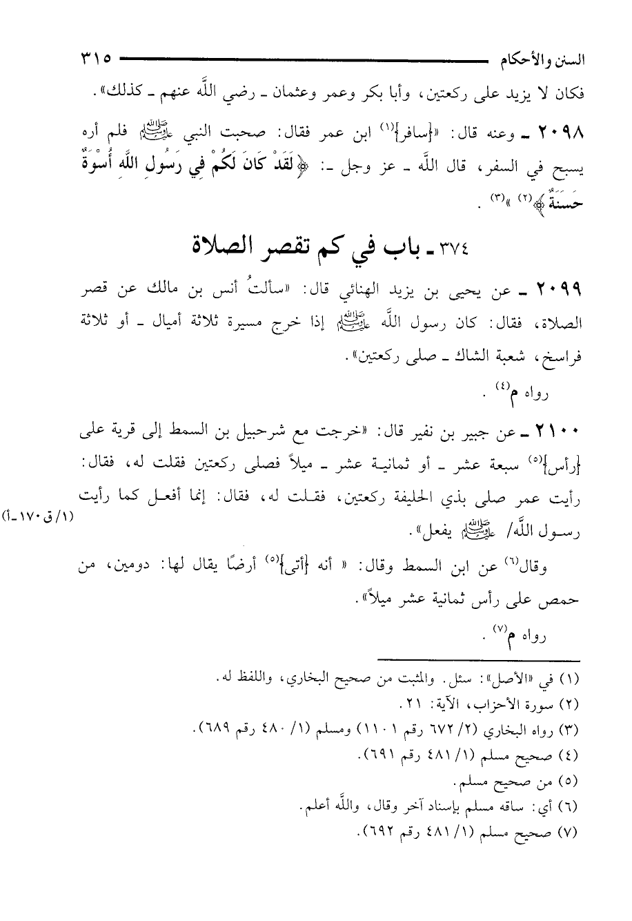 2100 - عن جبير بن نفير قال: "خرجت مع شرحبيل بن السمط إلى قرية على (رأس) (¬5) سبعة عشر -أو ثمانية عشر- ميلاً فصلى ركعتين فقلت له، فقال: رأيت عمر صلى بذي الحليفة ركعتين، فقلت له، فقال: إنما أفعل كما رأيت رسول الله - صلى الله عليه وسلم - يفعل".