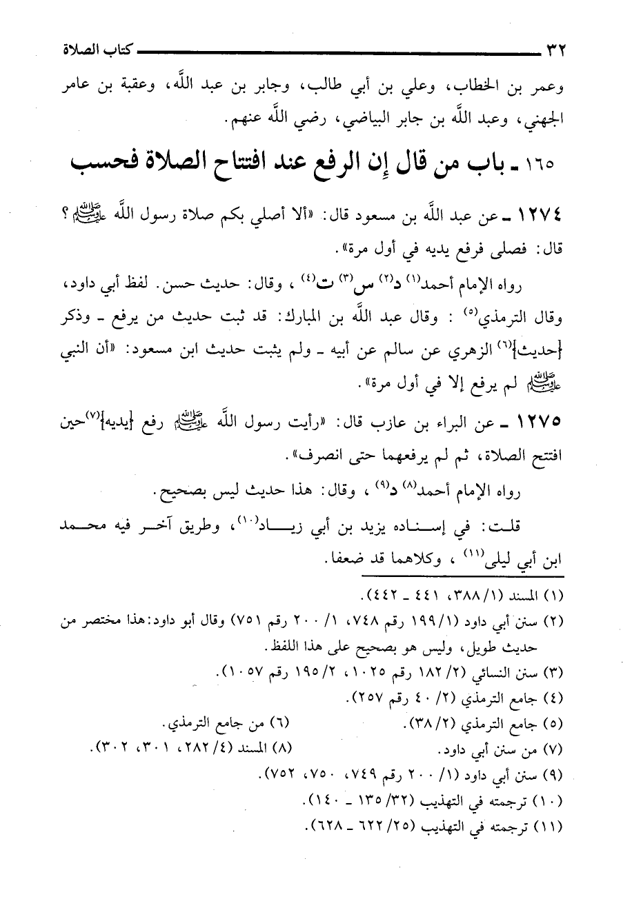 رواه الإمام أحمد (¬1) د (¬2) س (¬3) ت (¬4)، وقال: حديث حسن. لفظ أبي داود، وقال الترمذي (¬5): وقال عبد الله بن المبارك: قد ثبت حديث من يرفع -وذكر (حديث) (¬6) الزهري عن سالم عن أبيه- ولم يثبت حديث ابن مسعود: "أن النبي - صلى الله عليه وسلم - لم يرفع إلا في أول مرة".